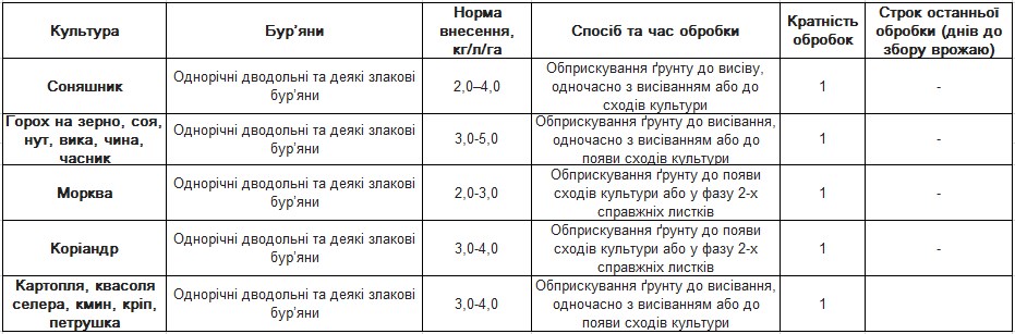 посіву – до сходів культури. Норма витрати препарату залежить від механічного