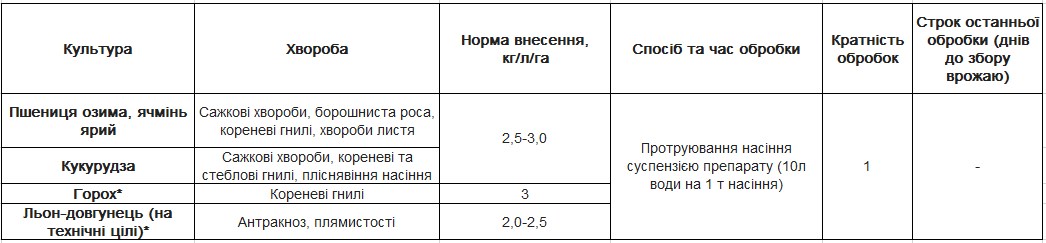 Норма витрат робочого розчину: 10 л на 1 т насіння (7-7,5 л води + 2,5-3,0 л препарату).