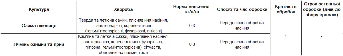 Новий фунгіцидний протруювач для зернових культур, який має широкий спектр дії проти основних хвороб на насінні та на початкових етапах росту культур.