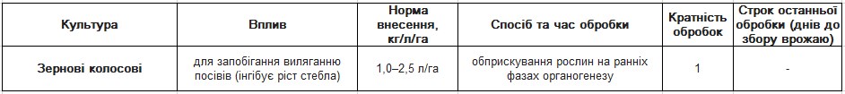 обприскування в період вегетації. Для досягнення максимального рістрегулюючого ефекту оптимальними фазами є: озимий ячмінь: ВВСН 37-39, озиме жито: ВВСН 37-39, озима пшениця: ВВСН 32-39, ярий ячмінь: ВВСН 32-49